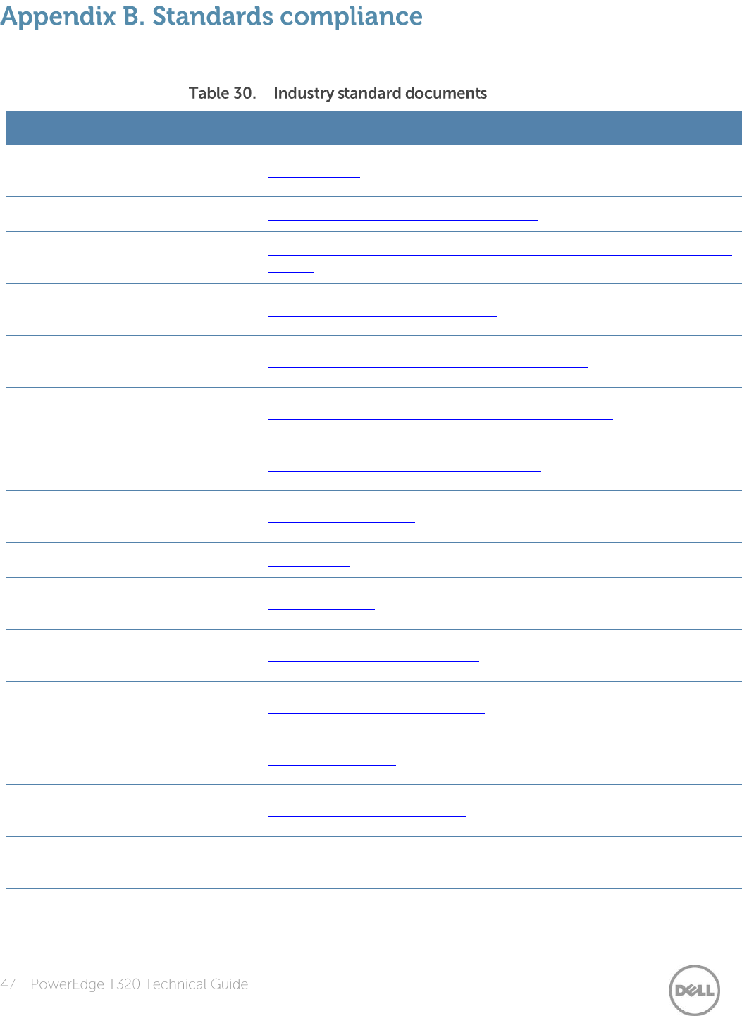 The Dell PowerEdge T320 conforms to the industry standards listed in Table 30.